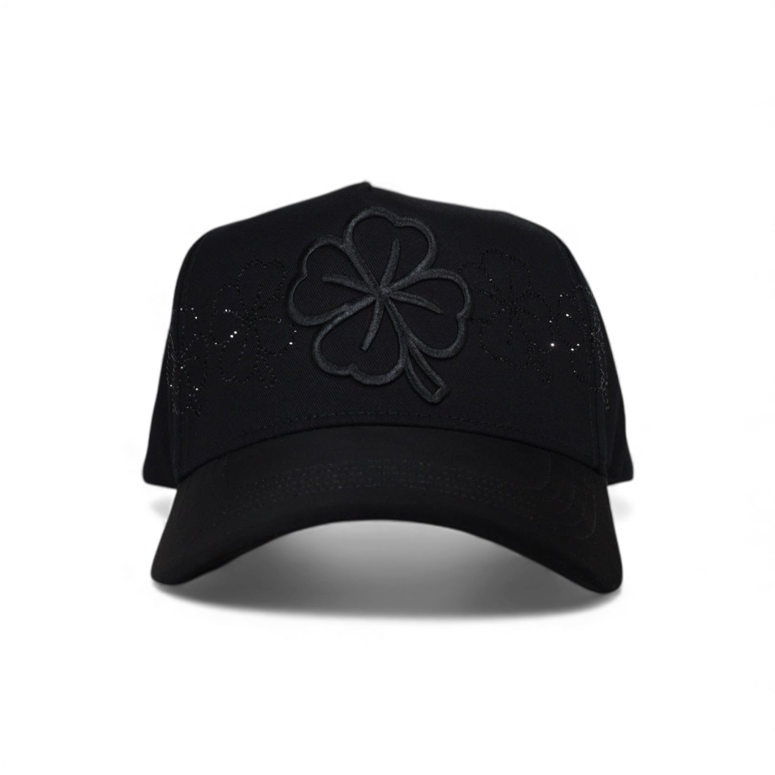 - Clover embroidered logo with rhinestone clovers on the front panel